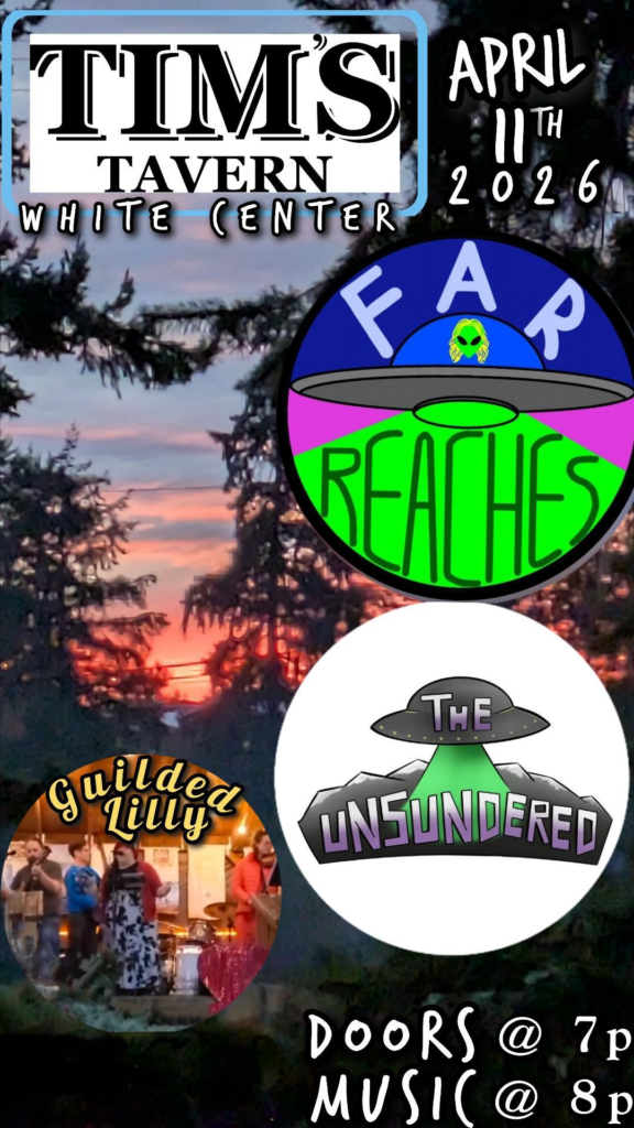 Join us for a great show with Far Reaches, The Unsunsered, Guilded Lilly on Saturday 4/11 at TIM’s in White Center, Seattle, WA! Our venue is all ages until 10pm (unless otherwise noted for a specific show). Seating is first-come, first serve. We have a full kitchen with omnivore and vegan menus plus gluten-free options, and a robust cocktail/bar list (21+ w/ID).