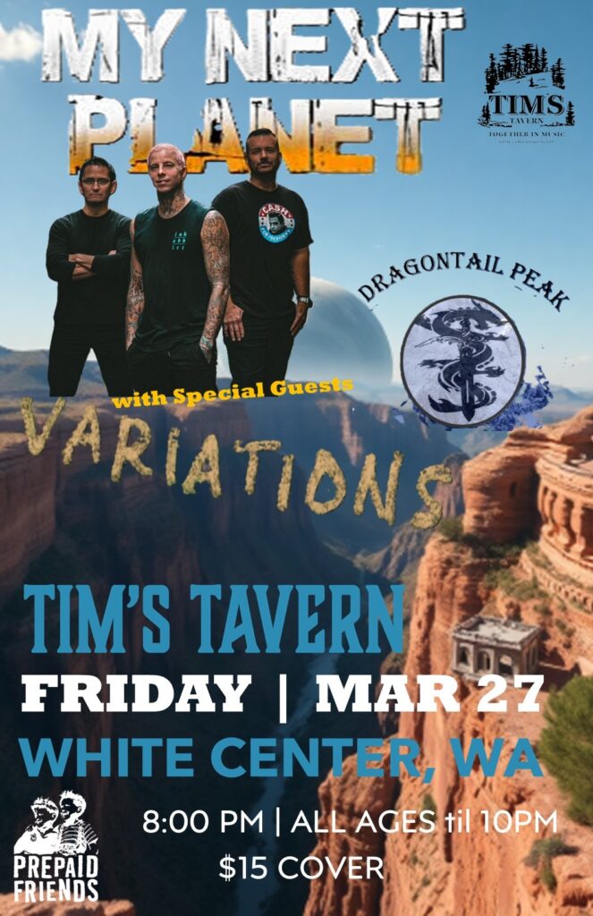 Join us for a great show with My Next Planet, Dragontail Peak and Variations on Friday 3/27 at TIM’s in White Center, Seattle, WA! Our venue is all ages until 10pm (unless otherwise noted for a specific show). Seating is first-come, first serve. We have a full kitchen with omnivore and vegan menus plus gluten-free options, and a robust cocktail/bar list (21+ w/ID).
