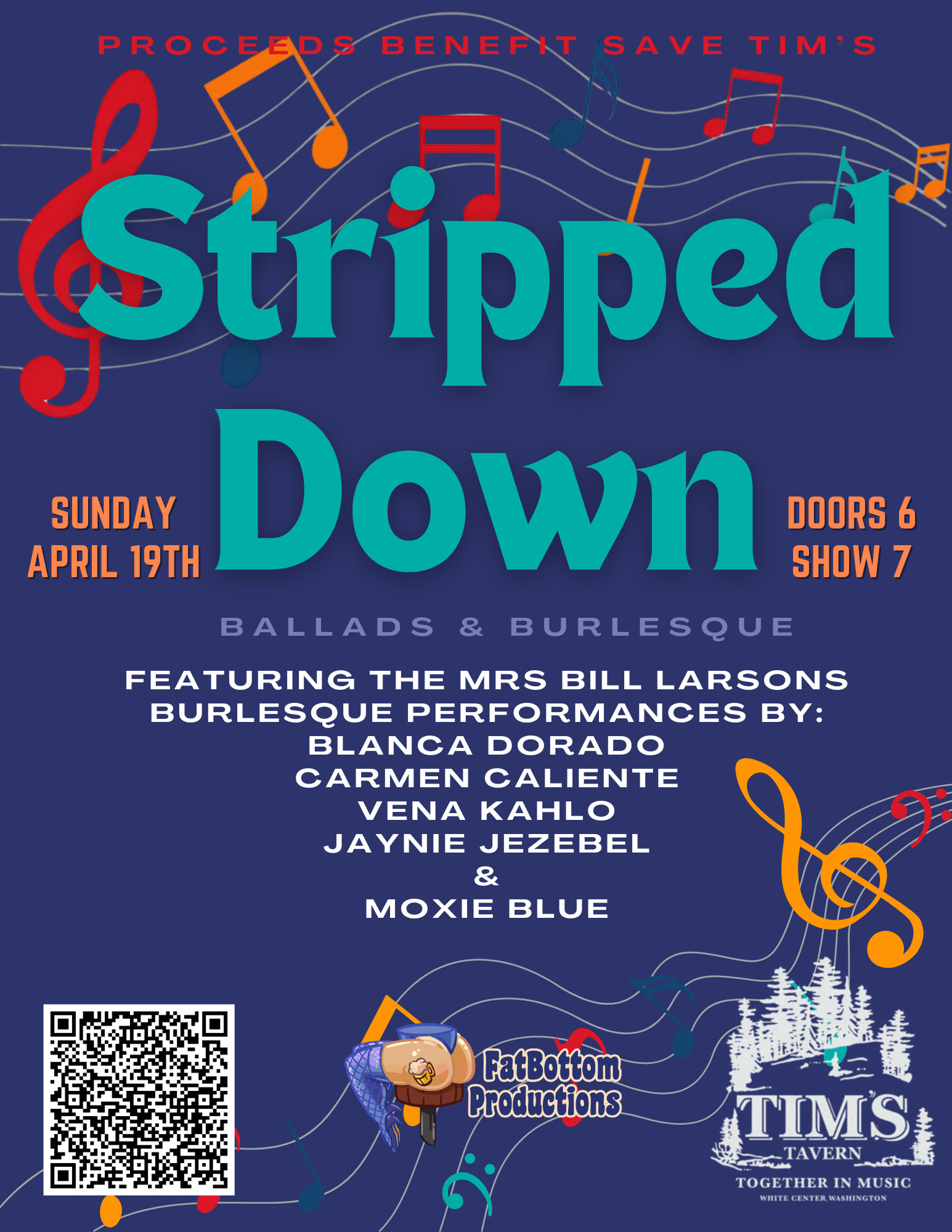 Fat Bottom Productions Burlesque presents: Stripped Down’ with The Mrs. Bill Larsens Join us for a great show as Fat Bottom Productions Burlesque presents: Stripped Down’ with The Mrs. Bill Larsens on Sunday April 19th at TIM’s in White Center, Seattle, WA! Our venue is all ages until 10pm (unless otherwise noted for a specific show). Seating […]